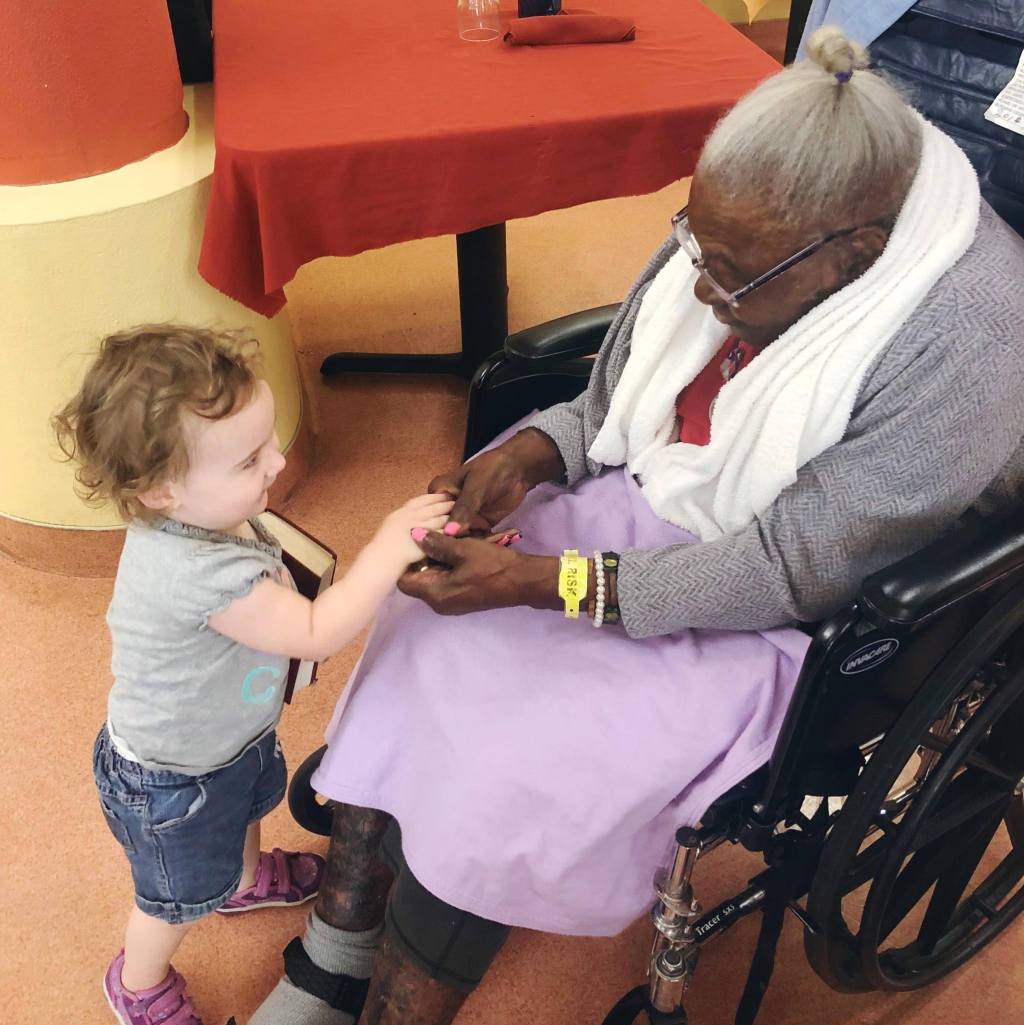 This is one of my favorite photos of all time. Our little two year old Vivianna greeting Miss Dinah -102 years old – at the nursing home. Truly precious!